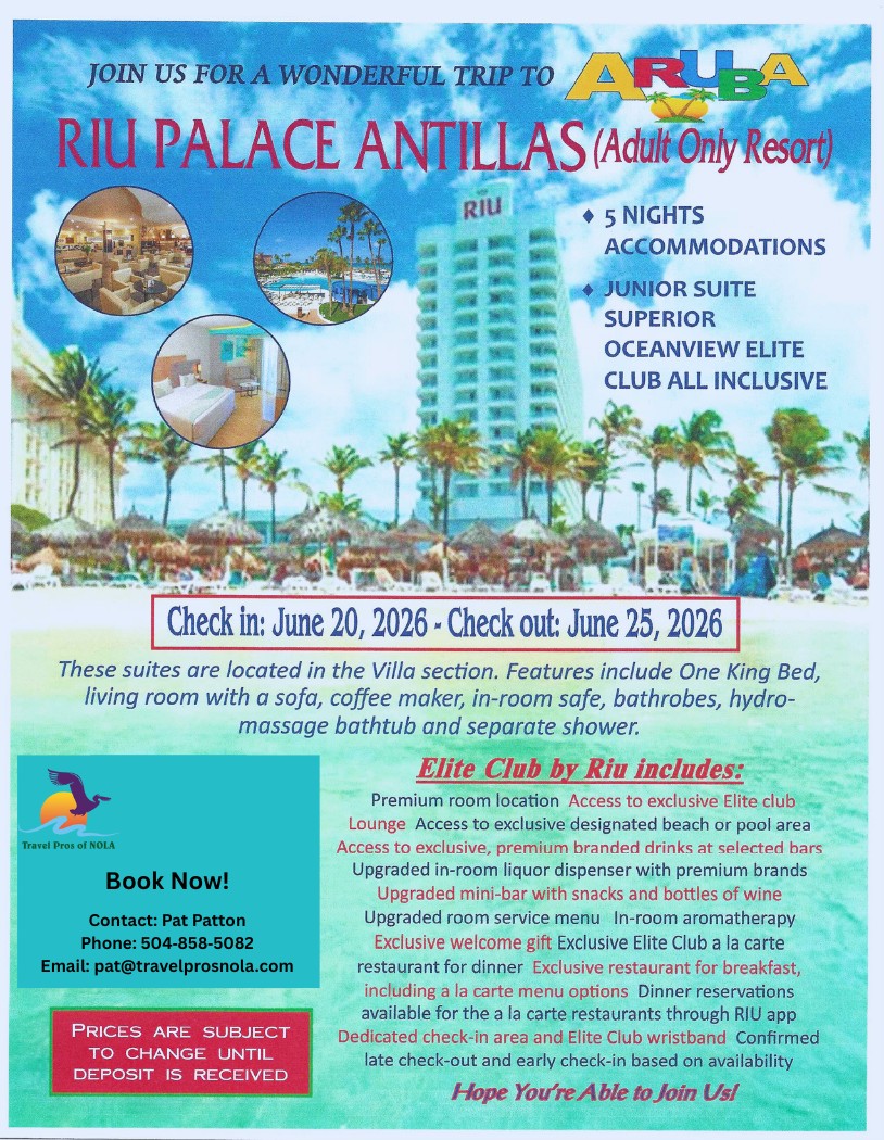 To Book, please contact Pat Patton Email: or Call: 504-858-5082